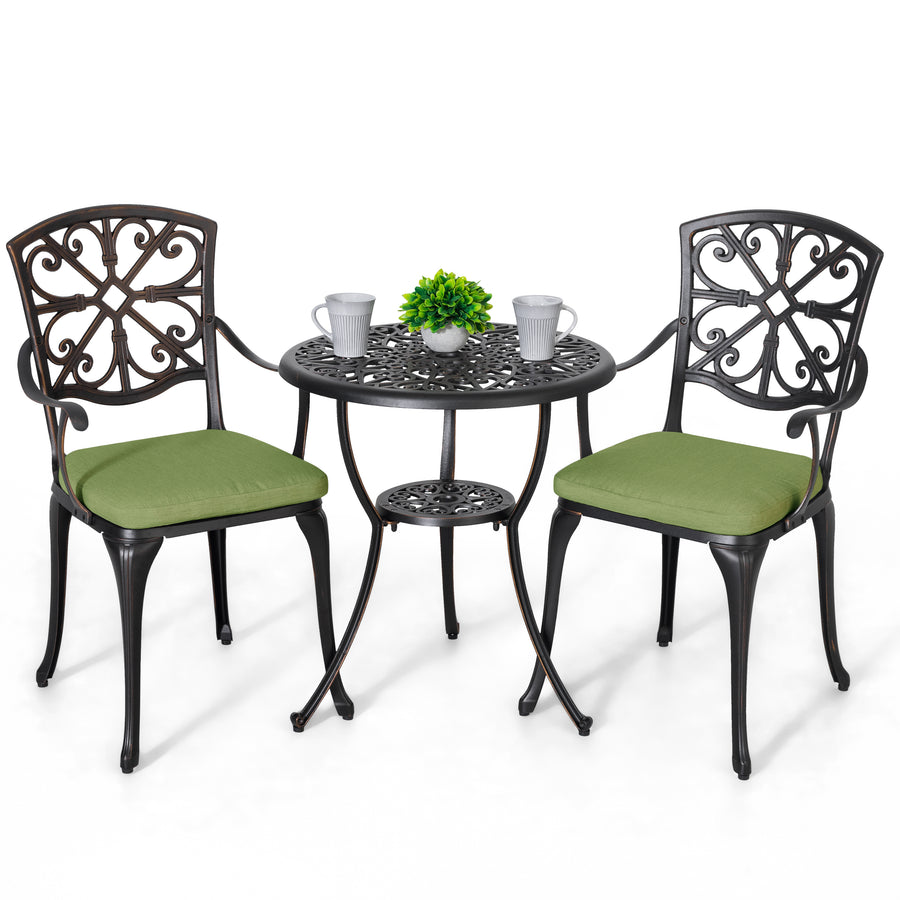 Uncover exceptional outdoor comfort with our 3-Piece Cast Aluminum Set, accompanied by soft?cushions. This set, showcasing a stylish table and two chairs, is designed for enduring comfort and timeless style. The robust cast aluminum construction guarantees durability against the elements, while the floral patterns seamlessly complement your outdoor decor. Adorned with 1.2-inch-thick cushions, this set creates a luxurious and inviting space for relaxation. Whether hosting guests or enjoying a serene moment, our patio bistro set combines comfort and sophistication, making it an ideal addition to your outdoor retreat.