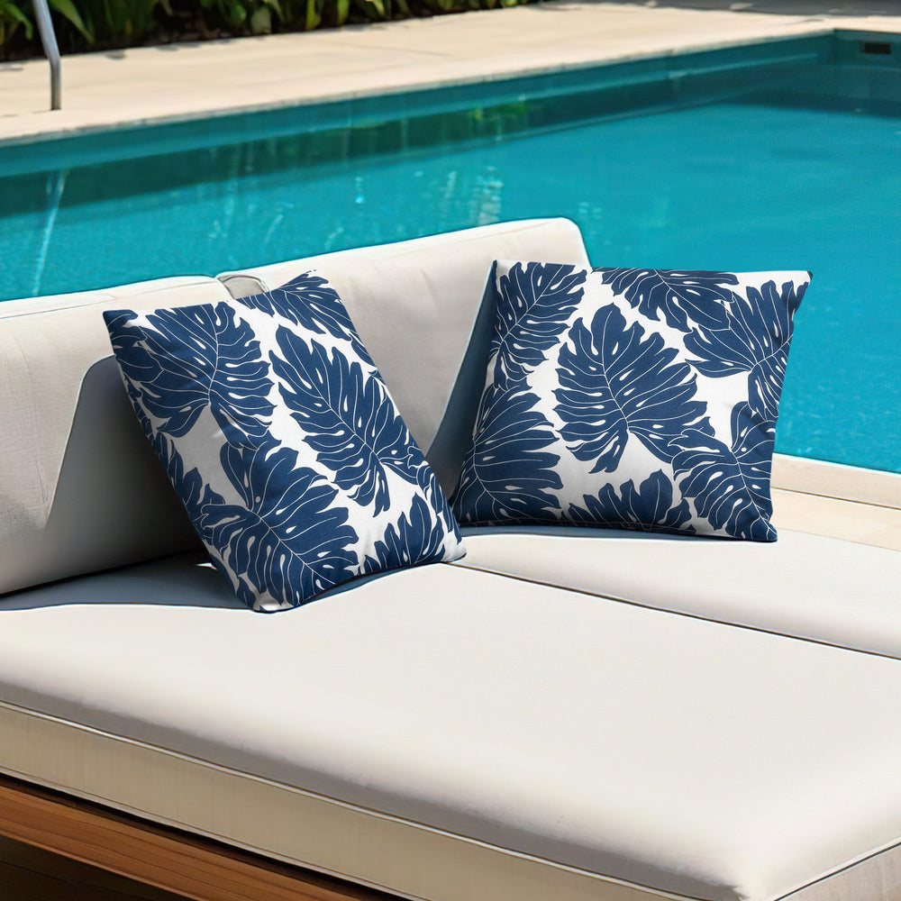 Soft and?durable, these outdoor throw pillows bring both comfort and character to your space. Made from high-quality, machine-washable polyester, they offer a thick, high-resilience feel for lasting support. Dark?blue tropical palm leaf patterns bring a refreshing, vibrant touch, mirroring the lush beauty of nature while adding a sense of tranquility to your outdoor space.?A smooth?zipper ensures easy maintenance. Omnipotent pillow?pairs effortlessly with versatile patio furniture, offering multiple uses for a stylish and functional outdoor space.