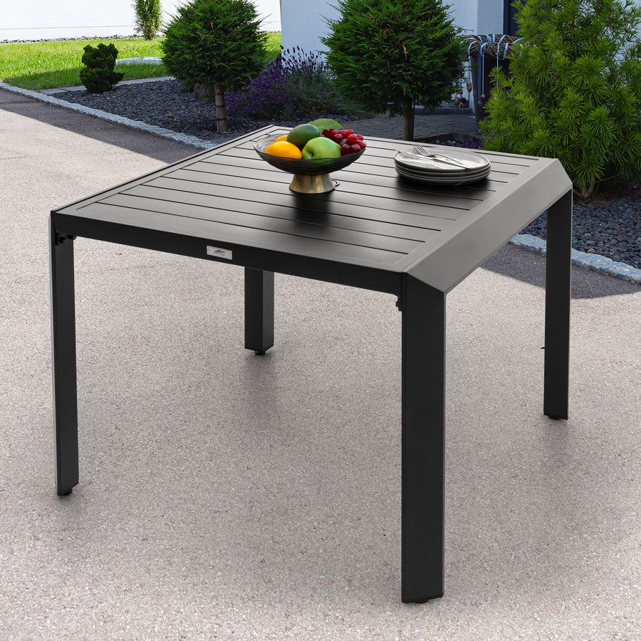 Discover the perfect centerpiece for your outdoor dining area with the Patio Time Outdoor Aluminum Dining Table! This elegant table is a harmonious blend of form and function, featuring a sleek black finish that enhances any outdoor decor. Designed for convenience, its open-slatted tabletop ensures excellent airflow and easy maintenance. The thoughtful inclusion of a 2.4?¡À umbrella hole keeps you shaded, while the inclined plane edge provides a natural resting place for your arms. With a sturdy aluminum frame and a weather-resistant powder-coated finish, this table promises?style and durability for memorable gatherings.