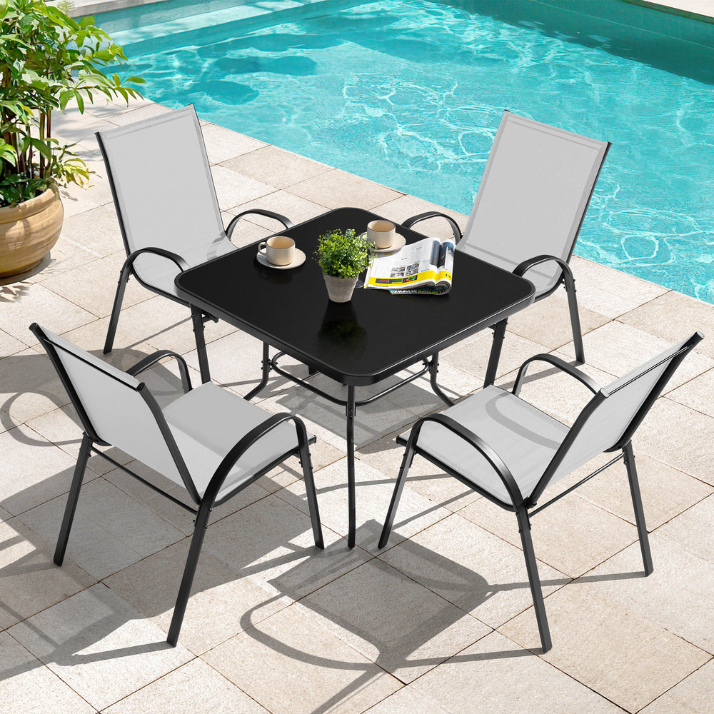 5 Piece Outdoor Dining Set, 4 All Weather Outdoor Textilene Patio Chairs and Square Tempered Glass Dining Table with Umbrella Hole