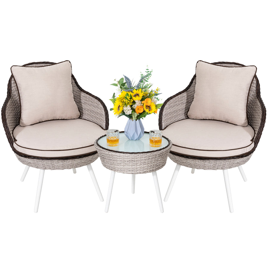 - 3-Piece Outdoor Set:?2 comfortable armchairs for you to enjoy lounging with a loved one, as well as a round accent table with a tempered glass top to place decor, snacks, and beverages.