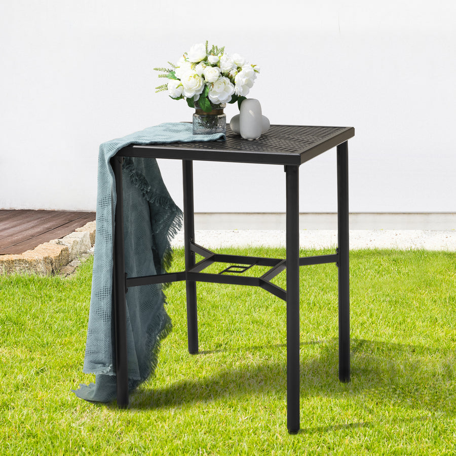 Mesh Lattice Tabletop: Bar height table provides perfectly blended use for your gatherings both outdoors or indoors. Smooth mesh iron tabletop holds many drinks and snacks and facilitates cleanup and quick-drying of rainwater.