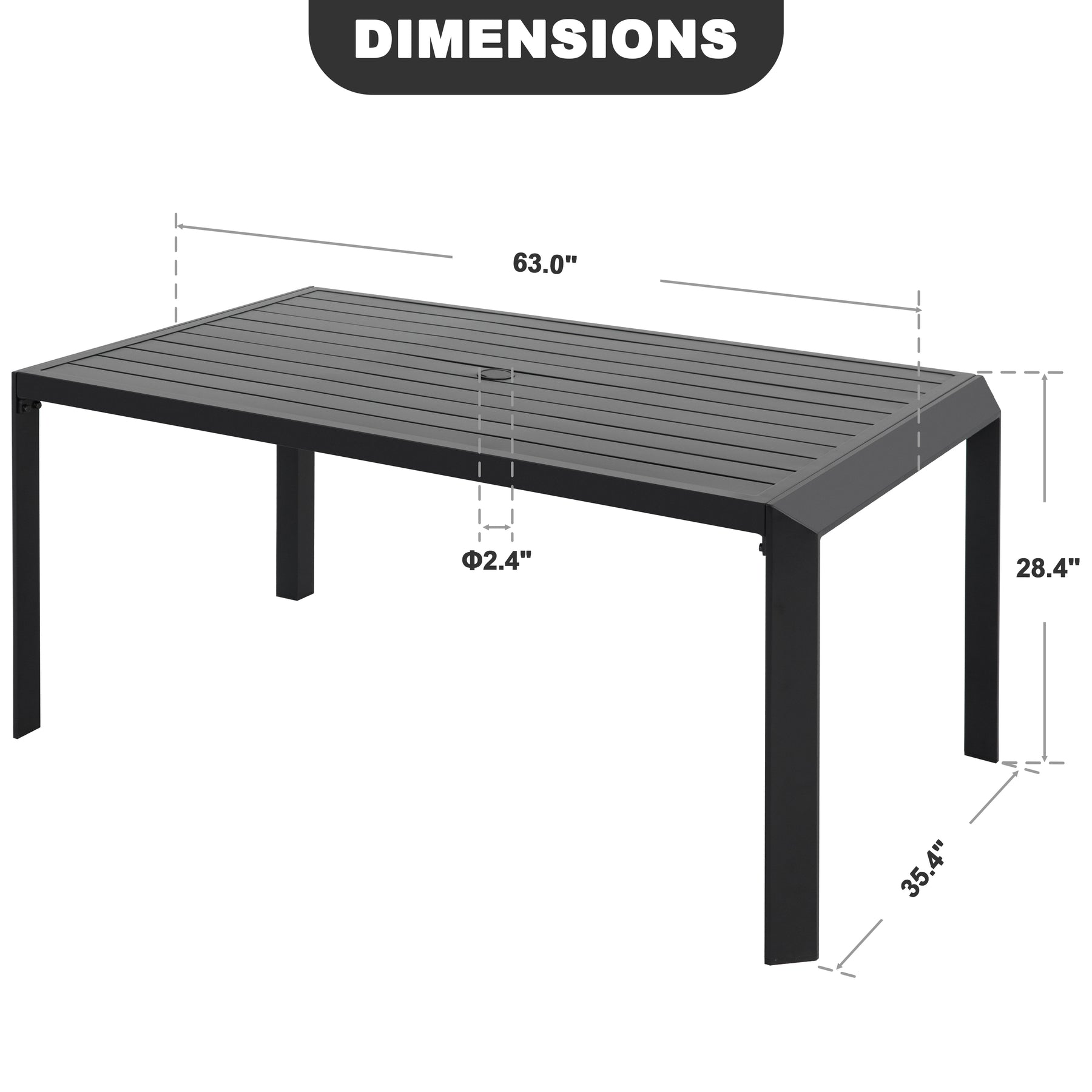 Get ready to host outdoor feasts that even the sun will envy! The Patio Time Outdoor Rectangle Dining Table is your secret weapon for transforming any backyard into a dining paradise. With its non-slip feet, this table stands strong, and the 2.4" umbrella hole lets you bask in the shade to elevate your outdoor dining experience. The inclined plane edge is perfect for resting your arms. Crafted from thick aluminum, it's sturdy enough to withstand your culinary masterpieces, all while exuding sleek sophistication in chic black. With ample space for up to six guests, prepare for memorable meals and laughter under the stars.
