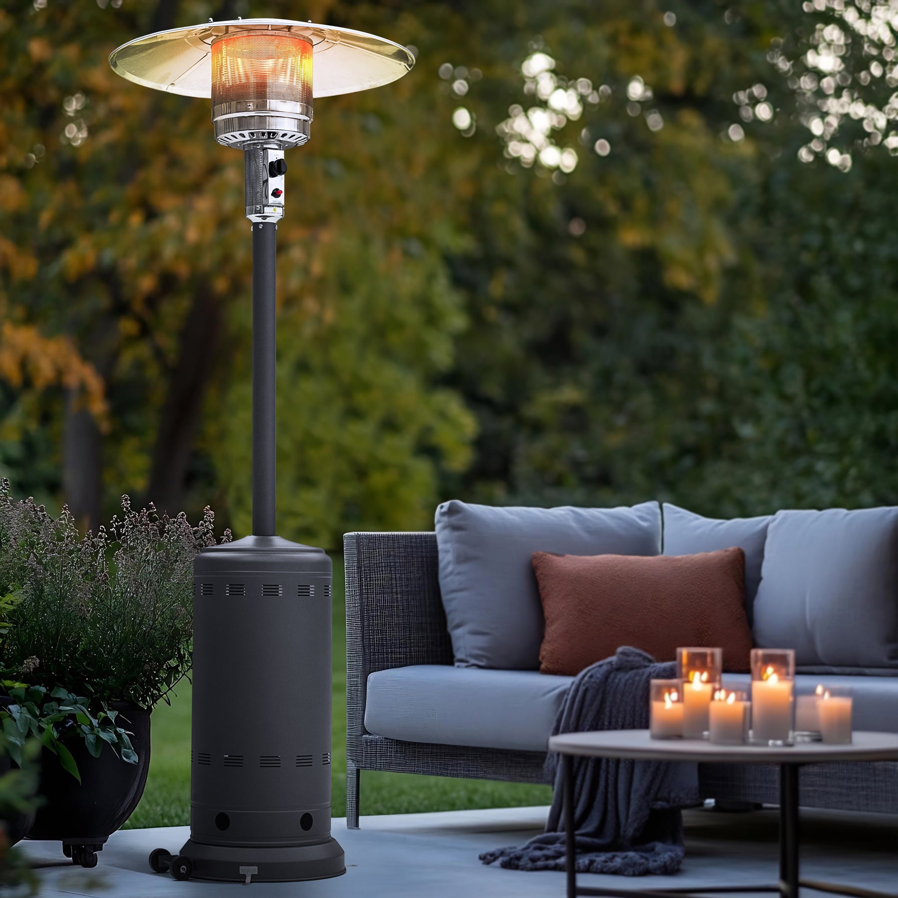 Stylish & Durable:?The outdoor heater features a sparkling gray coating that ensures it looks great over time. Equipped with?304 stainless?steel burner and aluminum reflector, it provides consistent heat output while maximizing and evenly distributing warmth.